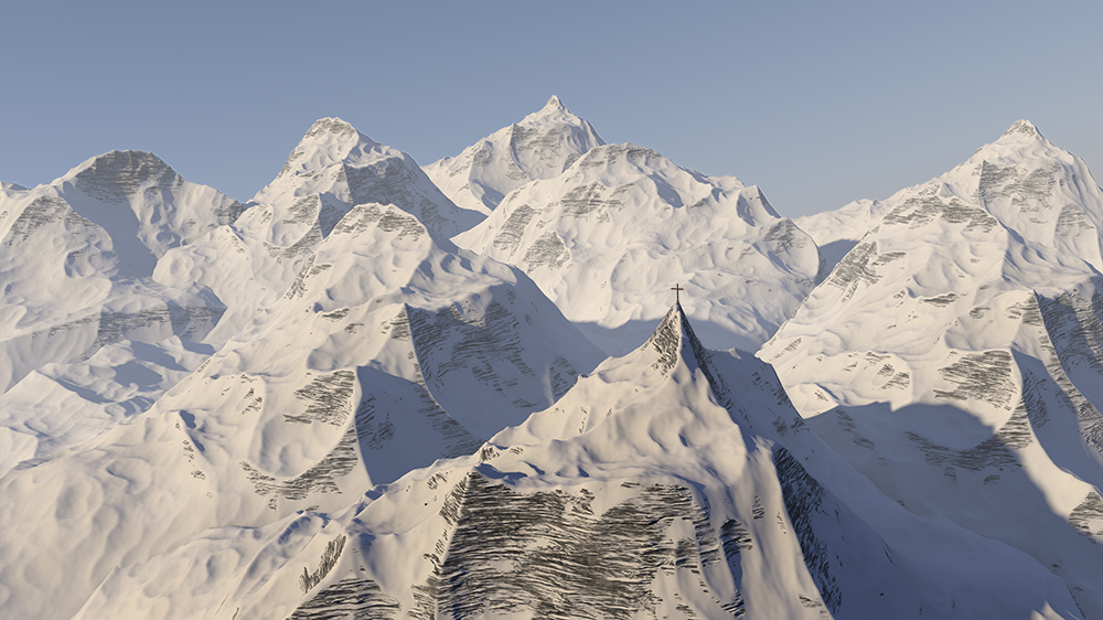 Grundlage dafür war das Landschaftsobjekt von C4D. Damit kann man alle möglichen Landschaftsformen gestalten. In diesem Fall war noch etwas strukturelle Nacharbeit nötig (Youtube Beitrag). Das witzig anmutende Gipfelkreuz wurde mit Photoshop ergänzt. Auch der realistische Dunsteffekt ist ein Shader. Den Begriff Shader könnte man mit einer Mischung aus Muster und Struktur bezeichnen, es gibt aber noch viel mehr Möglichkeiten.